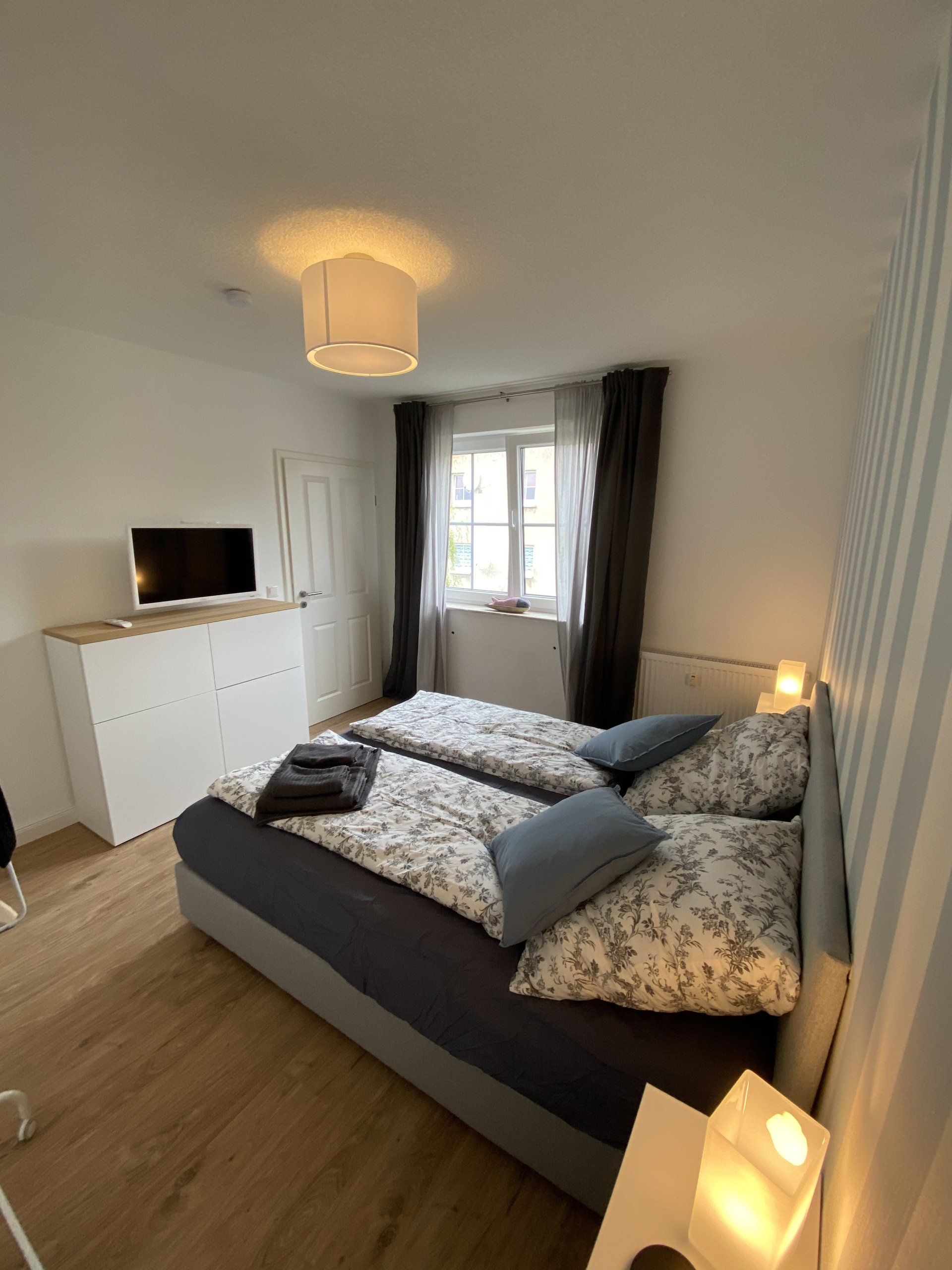 Sie betreten die Wohnung und finden sich in einem hellen Flur wieder, von dem Sie alle Räume bequem erreichen. Zu Ihr Linken finden Sie das großzügige Wohn- & Esszimmer. Die bodentiefen Fenster, die hochwertige Designerküche und das gemütliche Sofa läuten einen erholsamen Urlaub ein. Nebenan finden Sie das Schlafzimmer - ausgestattet mit einem hochwertigen Boxspringbett. Ebenfalls von dem Flur erreichen Sie das kernsanierte Tageslichtbad mit großzügiger, bodengleicher Regendusche und Waschmaschine.